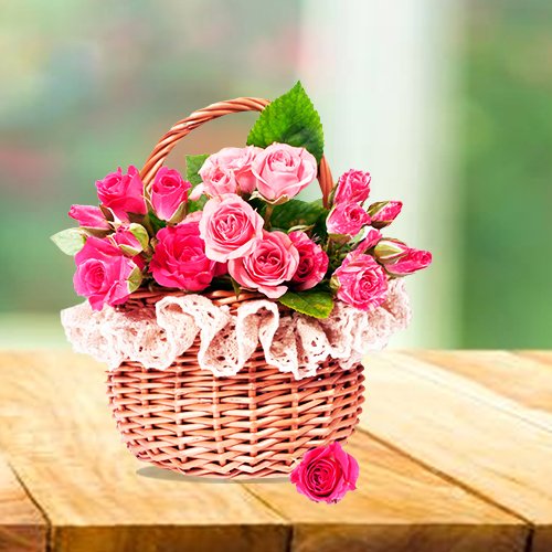 A charming basket arrangement of 10 fresh pink roses, thoughtfully paired with lush green fillers. This elegant creation symbolizes grace, admiration, and affection, making it a perfect gift for birthdays, anniversaries, or heartfelt celebrations.