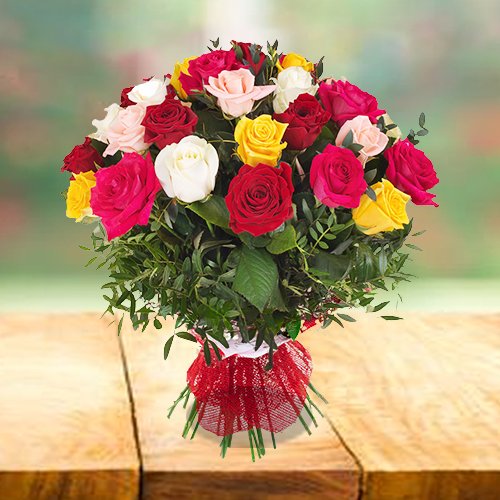 The Garden of Roses is a charming bouquet of 12 assorted color roses, beautifully tied with a ribbon. Symbolizing love, happiness, and togetherness, this vibrant arrangement makes a perfect gift for every joyful occasion.