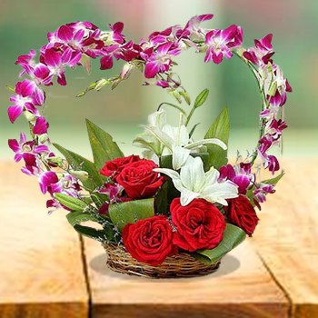 The Lovely Heart Basket is a romantic basket of roses arranged in a heart shape, making it a perfect gift for love-filled occasions.