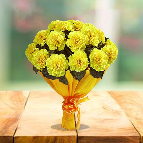 The Silky Yellow Carnation bouquet features fresh yellow carnations arranged beautifully, symbolizing joy, success, and positivity.