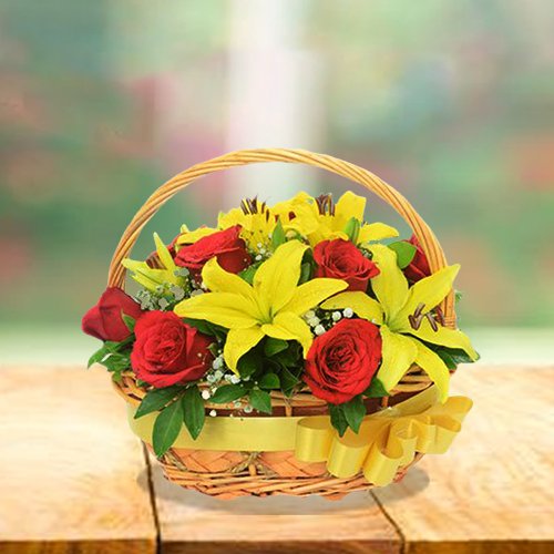 The Yellow & Red Beauty in Basket is a delightful combination of fresh yellow and red roses, symbolizing friendship, happiness, and passion.